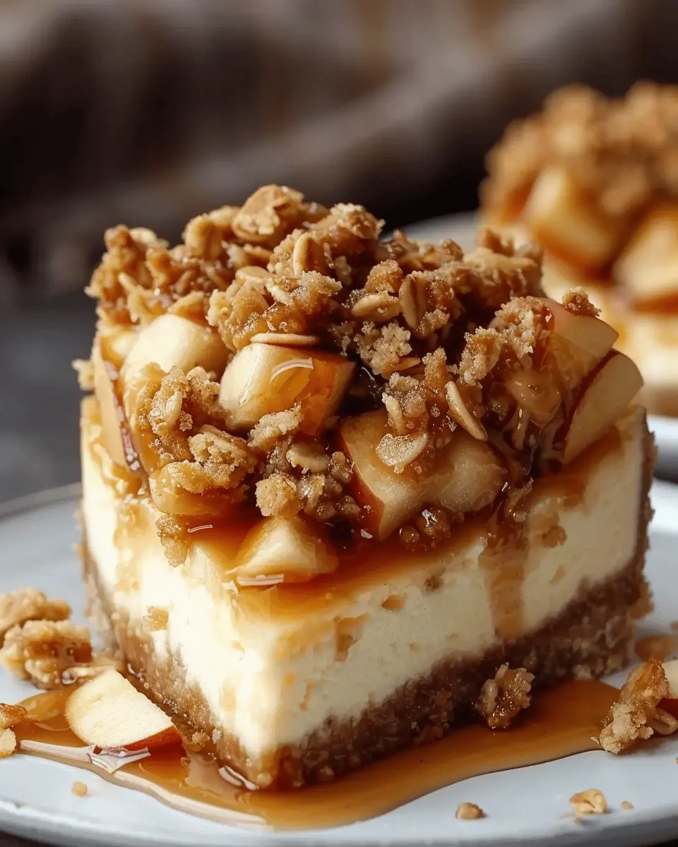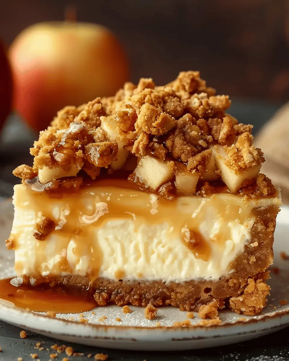 Experience the delightful fusion of apple crisp and cheesecake in this indulgent dessert. Perfect for any occasion!