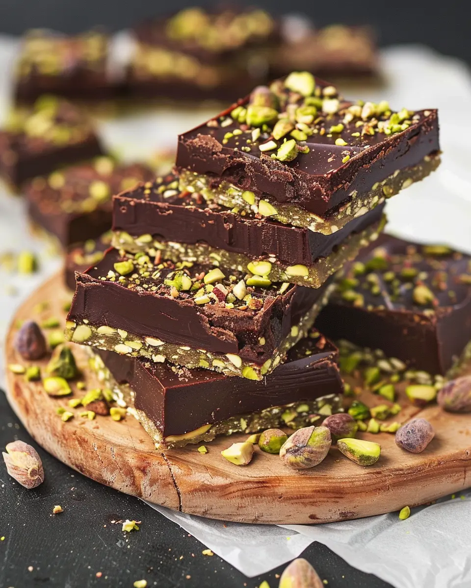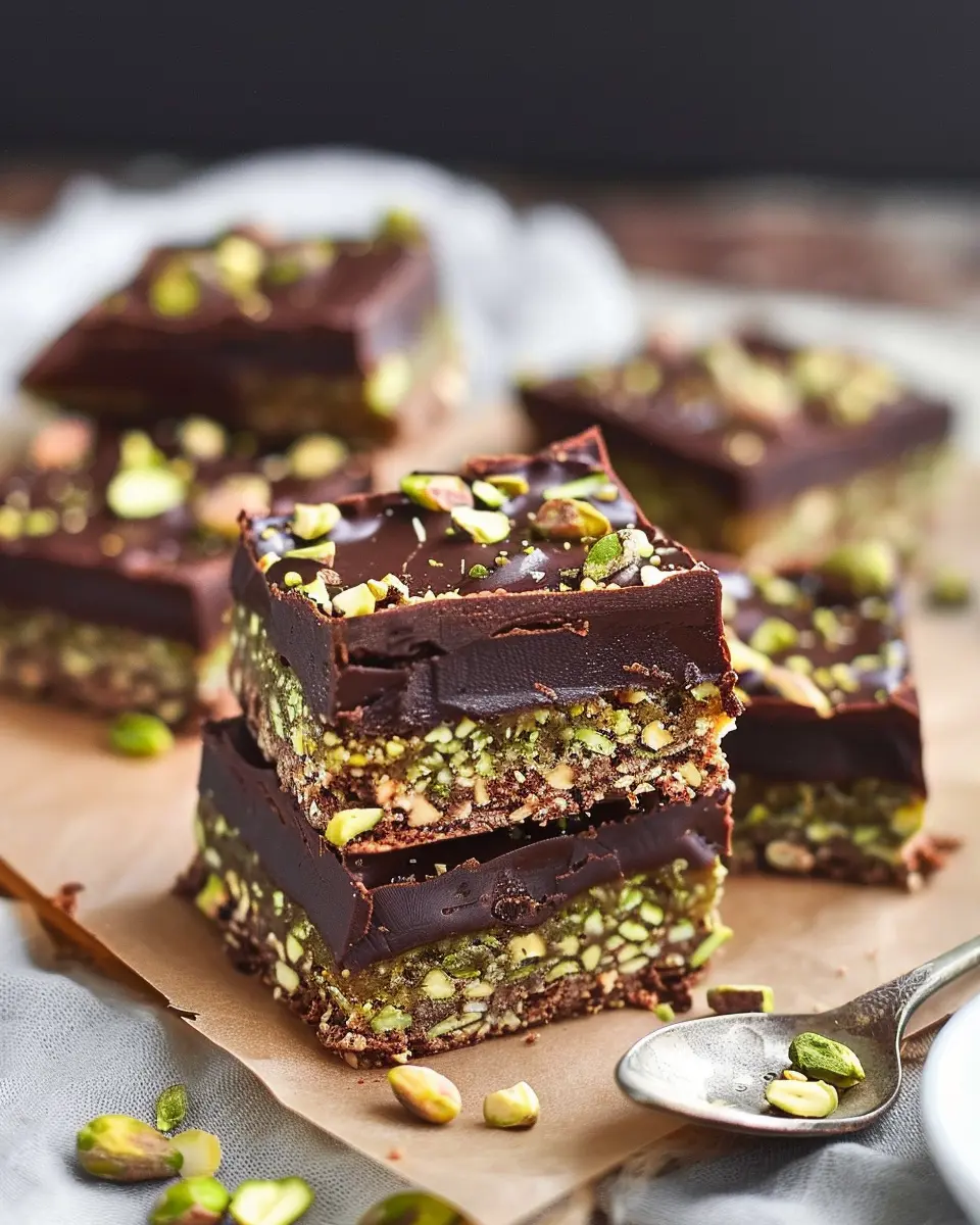 Indulge in the rich flavors of chocolate and the unique crunch of pistachios with these delightful bars.