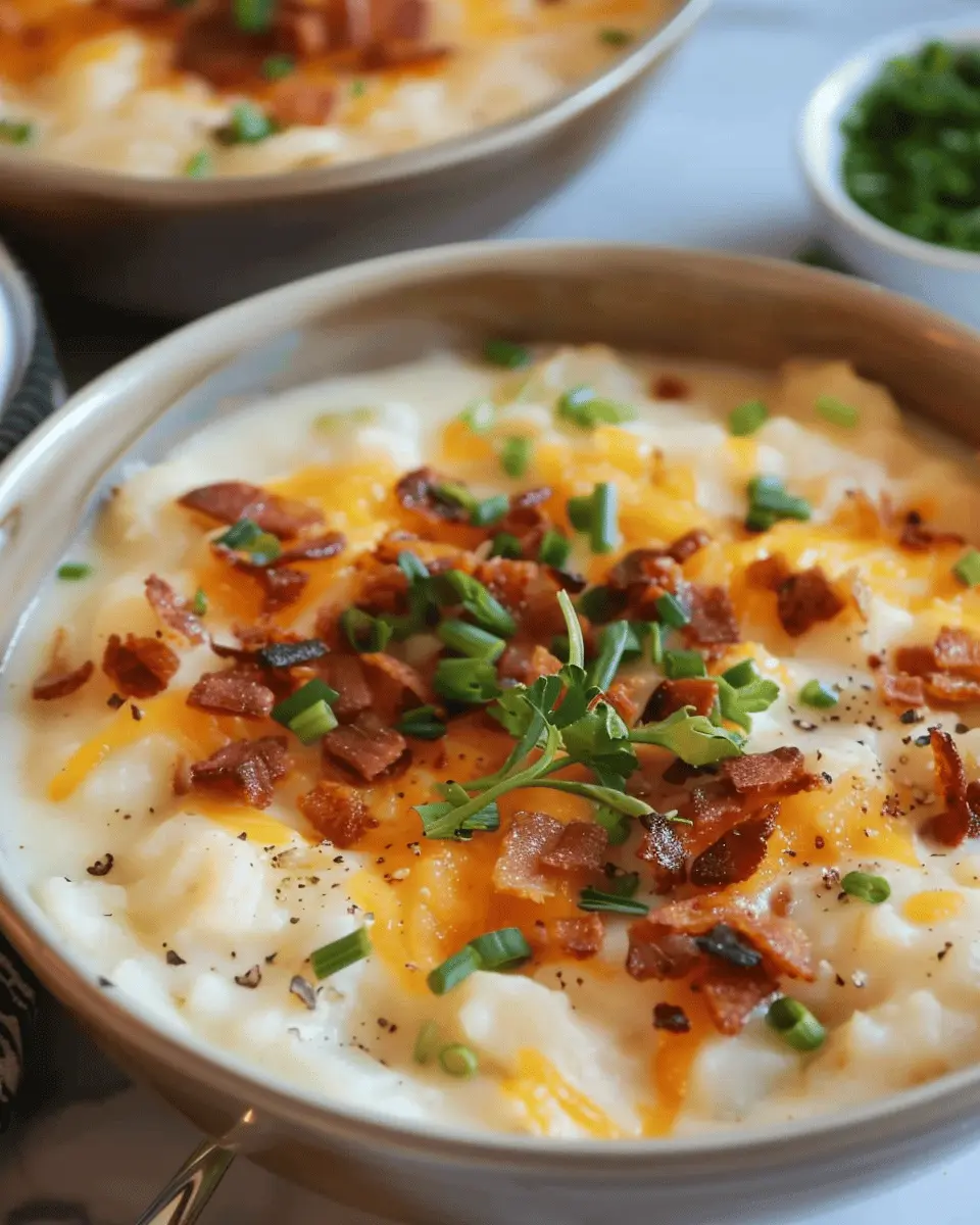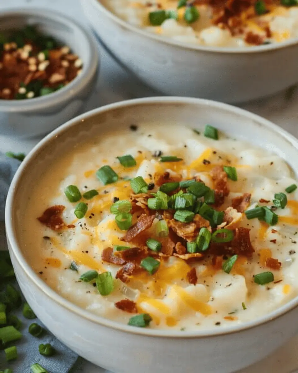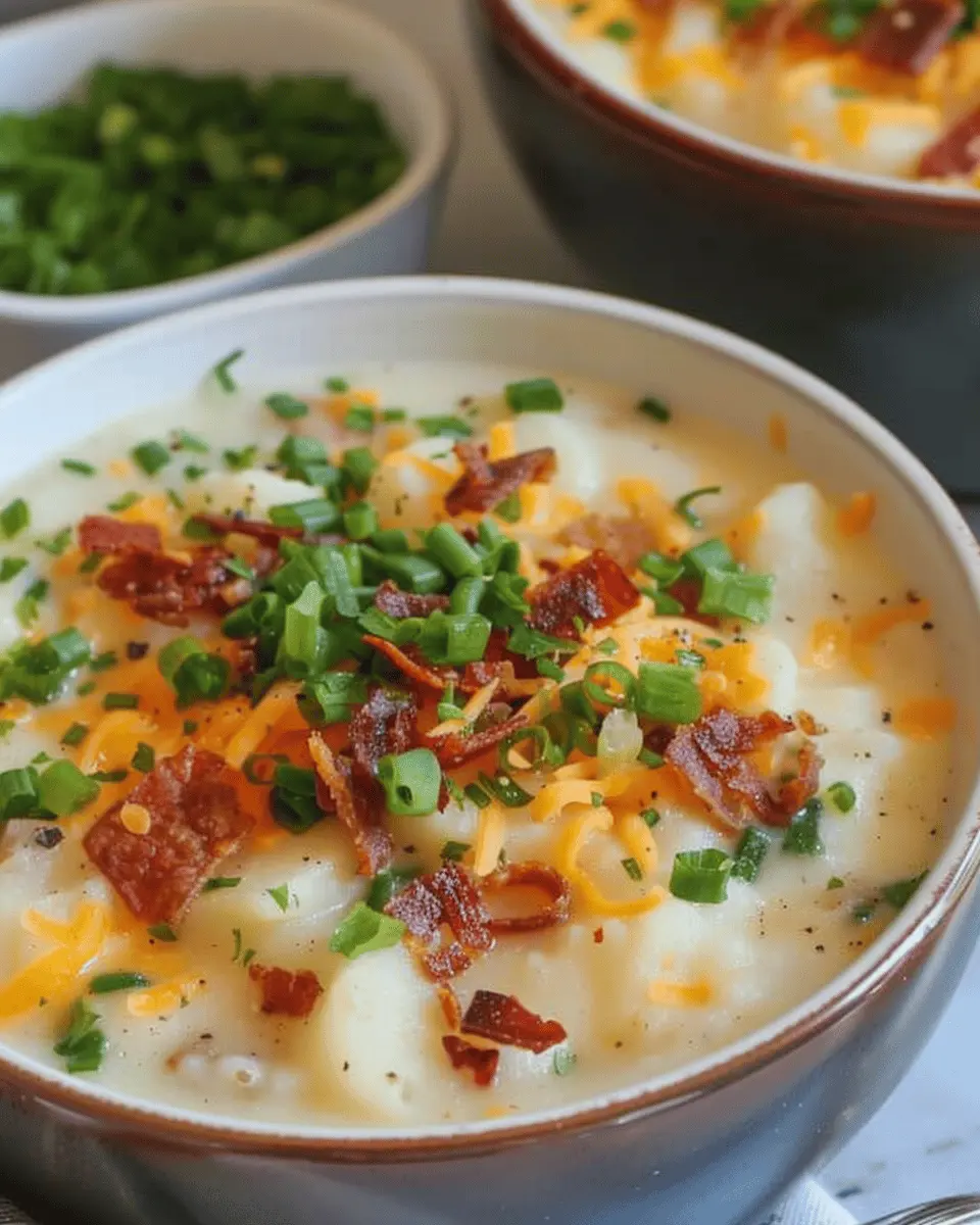 Once everything is combined and heated through, it’s time for the best part: serving your masterpiece! Ladle the soup into bowls and top with crispy turkey bacon pieces and diced chicken ham if you opted for those. They add a delightful crunch and flavor contrast. Don’t forget the chives or green onions on top for that fresh finish!