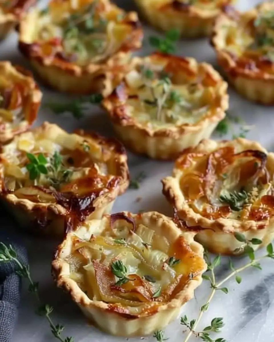 Delicious and easy-to-make French onion tartlets topped with turkey bacon, perfect for any gathering.