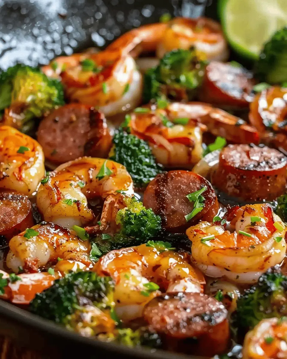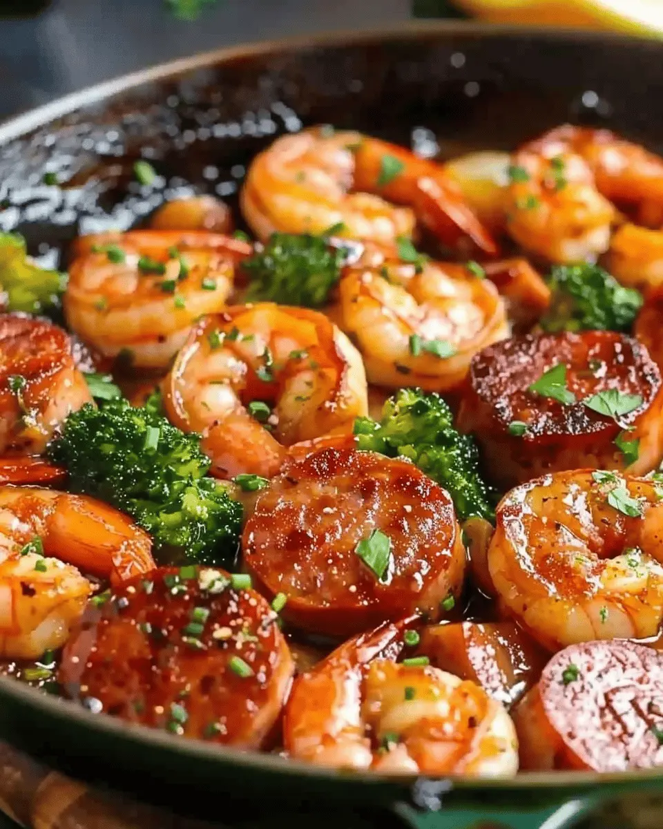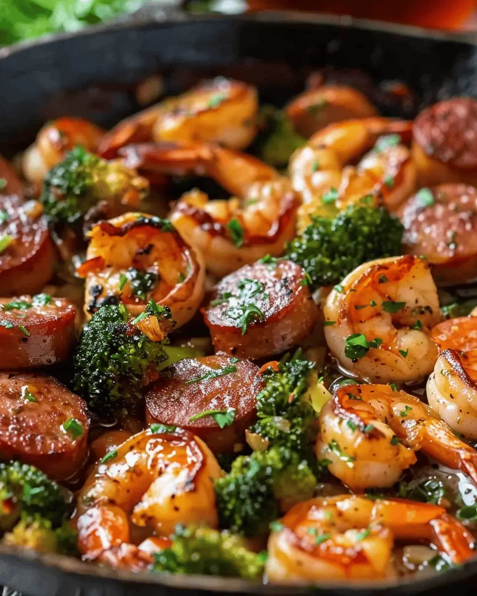 Once the shrimp is ready, pour the prepared honey garlic sauce over the shrimp, sausage, and broccoli mixture. Let it all come together by simmering for another 2–3 minutes. The sauce will thicken slightly, creating a sticky glaze that envelops the ingredients beautifully. At this stage, feel free to taste and adjust seasonings if needed.