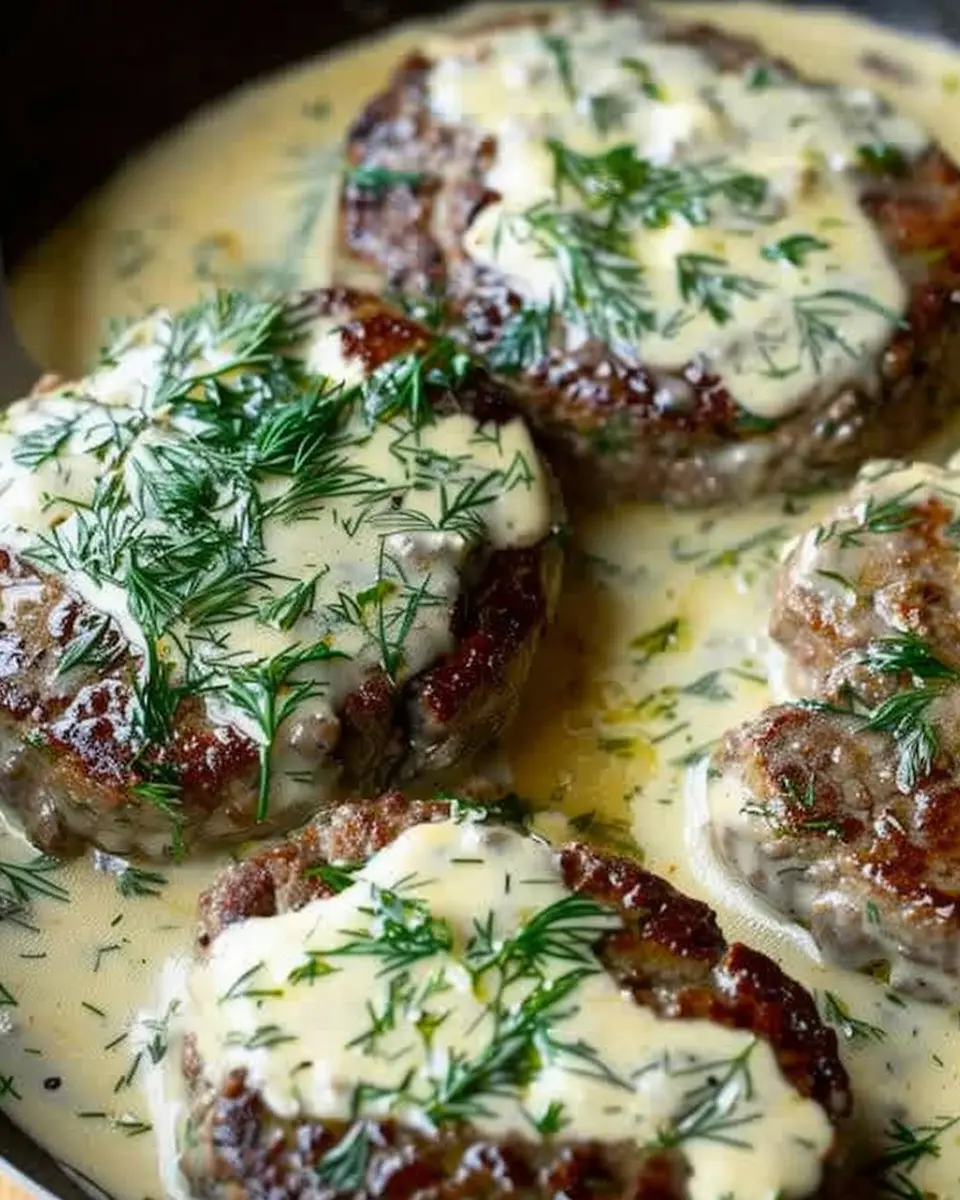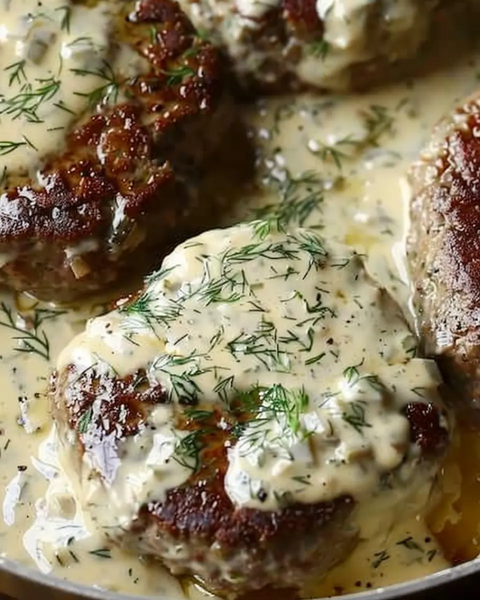 Enjoy the rich flavors of homemade Hamburger Steaks in Creamy Dill Sauce, perfect for a comforting meal.