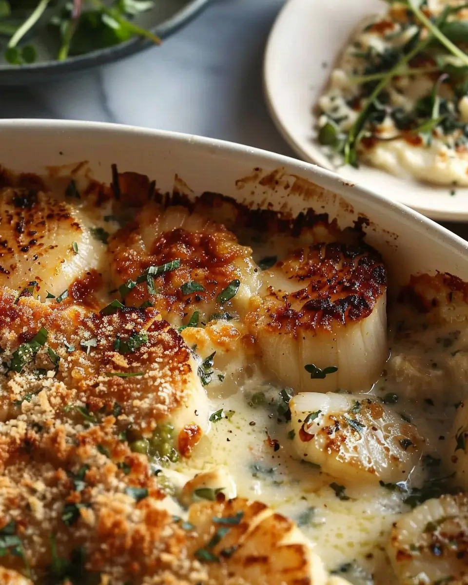A luxurious and easy-to-make scallop gratin recipe that combines the rich flavors of scallops with a creamy sauce and a crunchy topping.
