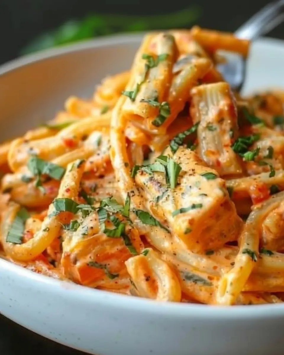 Indulge in a rich and creamy pasta dish featuring savory turkey bacon and a delightful tomato garlic sauce. Perfect for a cozy meal!