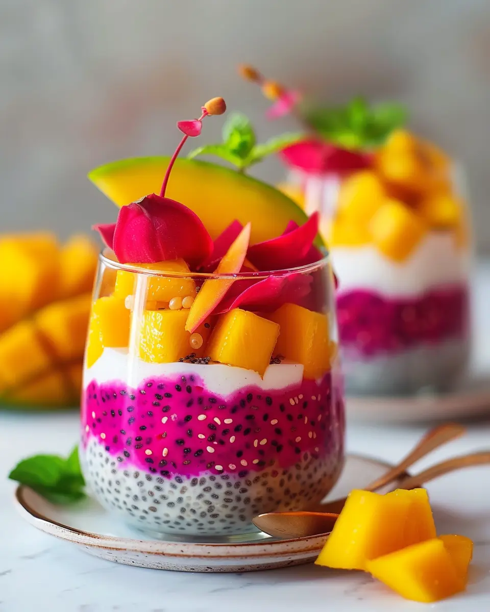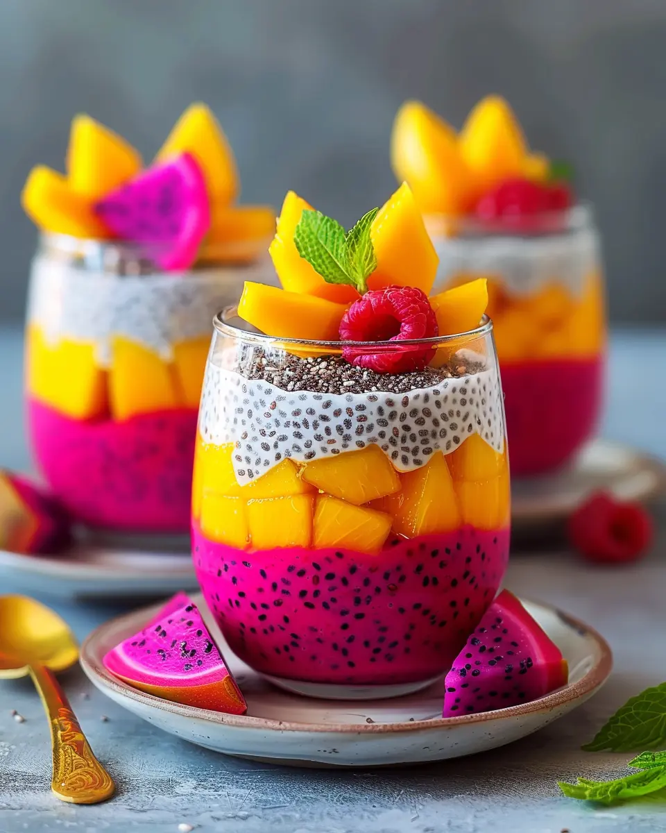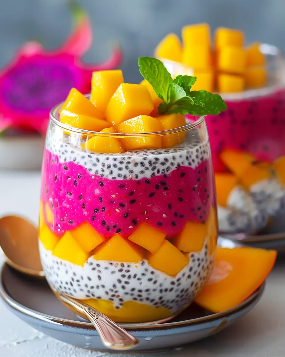 A delicious and refreshing chia pudding made with mango and dragon fruit, perfect for a healthy breakfast or dessert.
