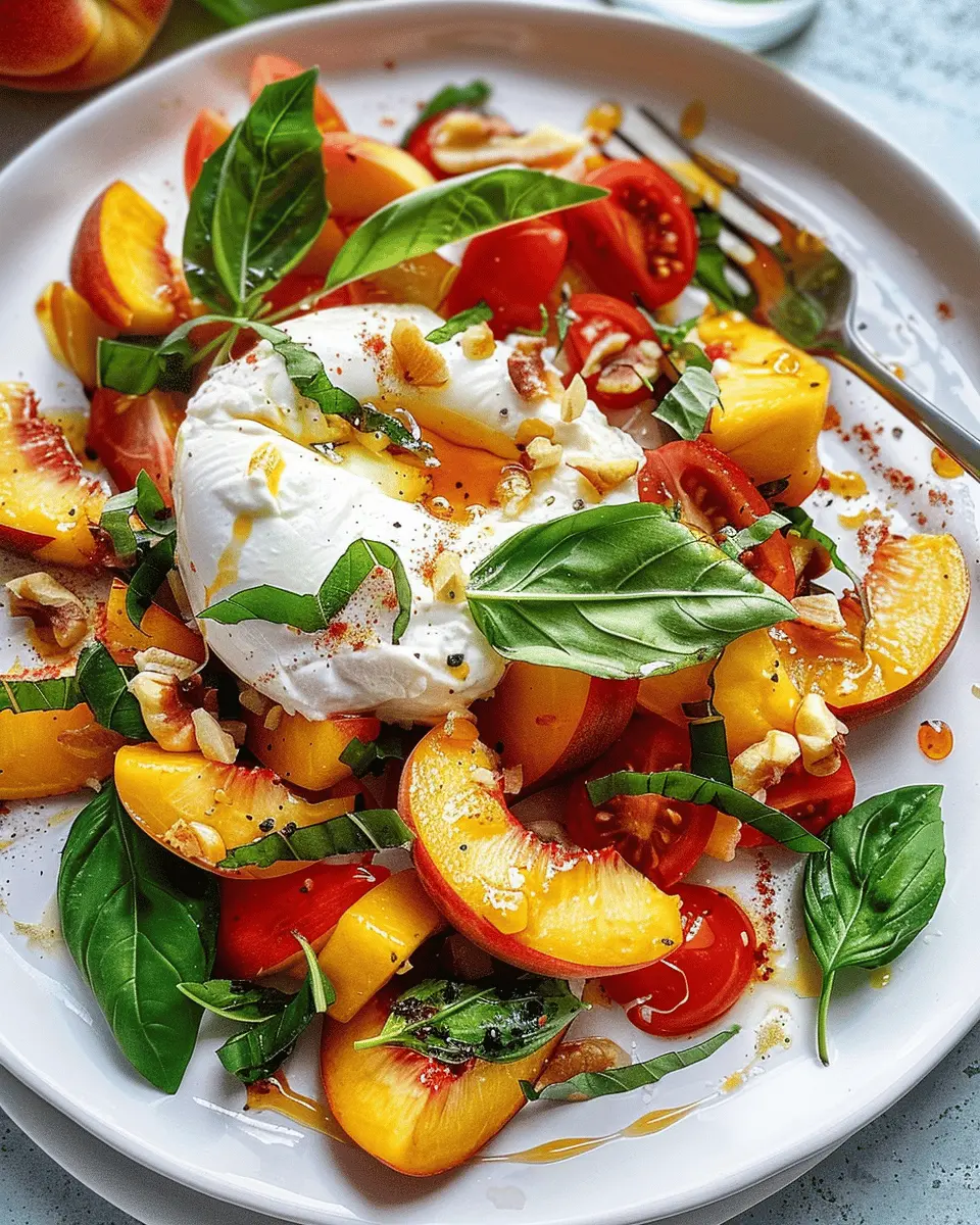 The peach burrata salad offers the perfect balance between sweetness and creaminess. Peaches, when in season, are incredibly juicy and fragrant. Did you know that peaches are loaded with vitamins A and C? They not only contribute to your overall health but also add natural sweetness without any guilt. Combine this with burrata, a decadent cheese renowned for its soft, creamy interior, and you have a match made in culinary heaven.