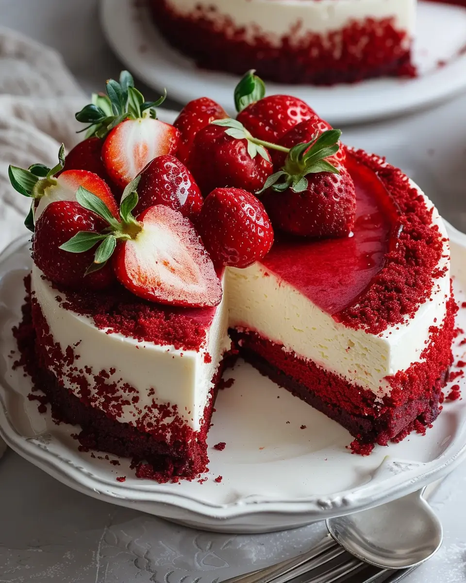 Indulge in the rich, creamy goodness of Red Velvet Strawberry Cheesecake, a delightful dessert that combines the classic flavors of red velvet and strawberries.