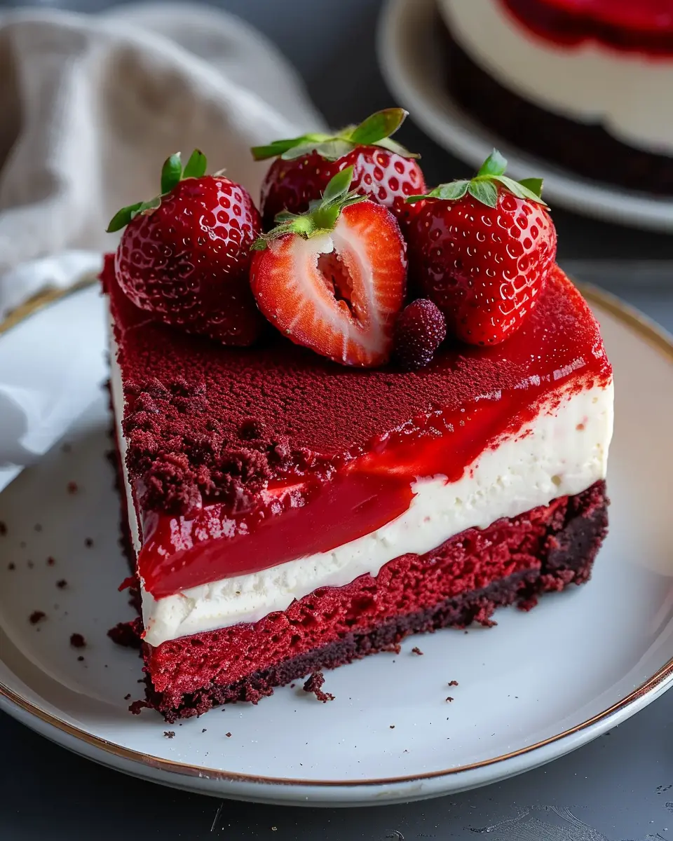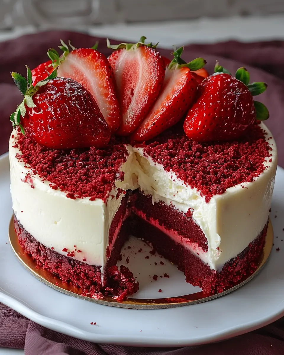After chilling, top with fresh strawberries macerated with sugar for a vibrant finish. Your red velvet strawberry cheesecake is now ready to impress—serving it will be the highlight of your next gathering!