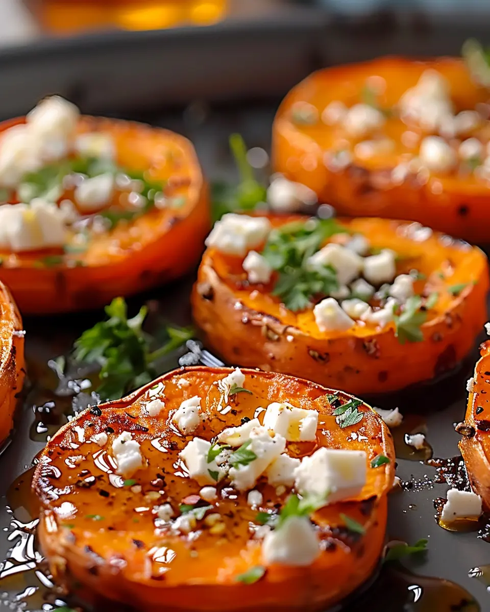 Delightful roasted sweet potato rounds topped with honey and feta create a perfect appetizer or side dish.
