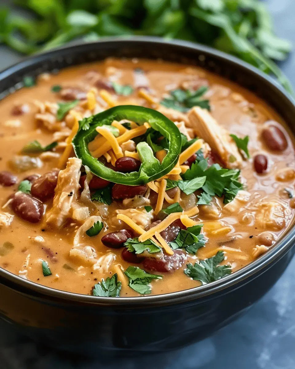 A hearty chili made with cream cheese, chicken, and turkey bacon.