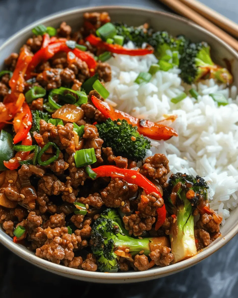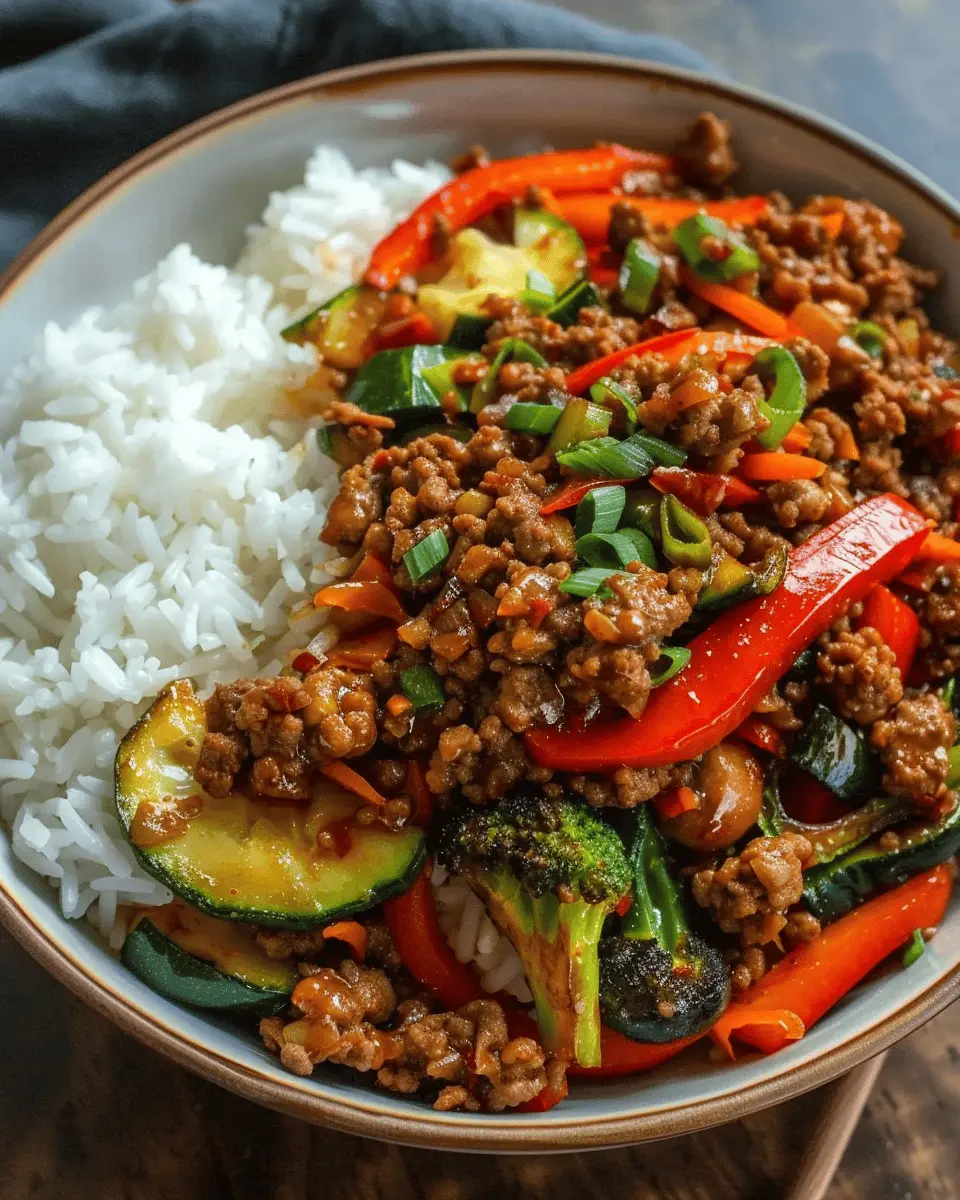 Keywords: Spicy Ground Beef Stir-Fry, Garlic Veggies, Rice Bowl