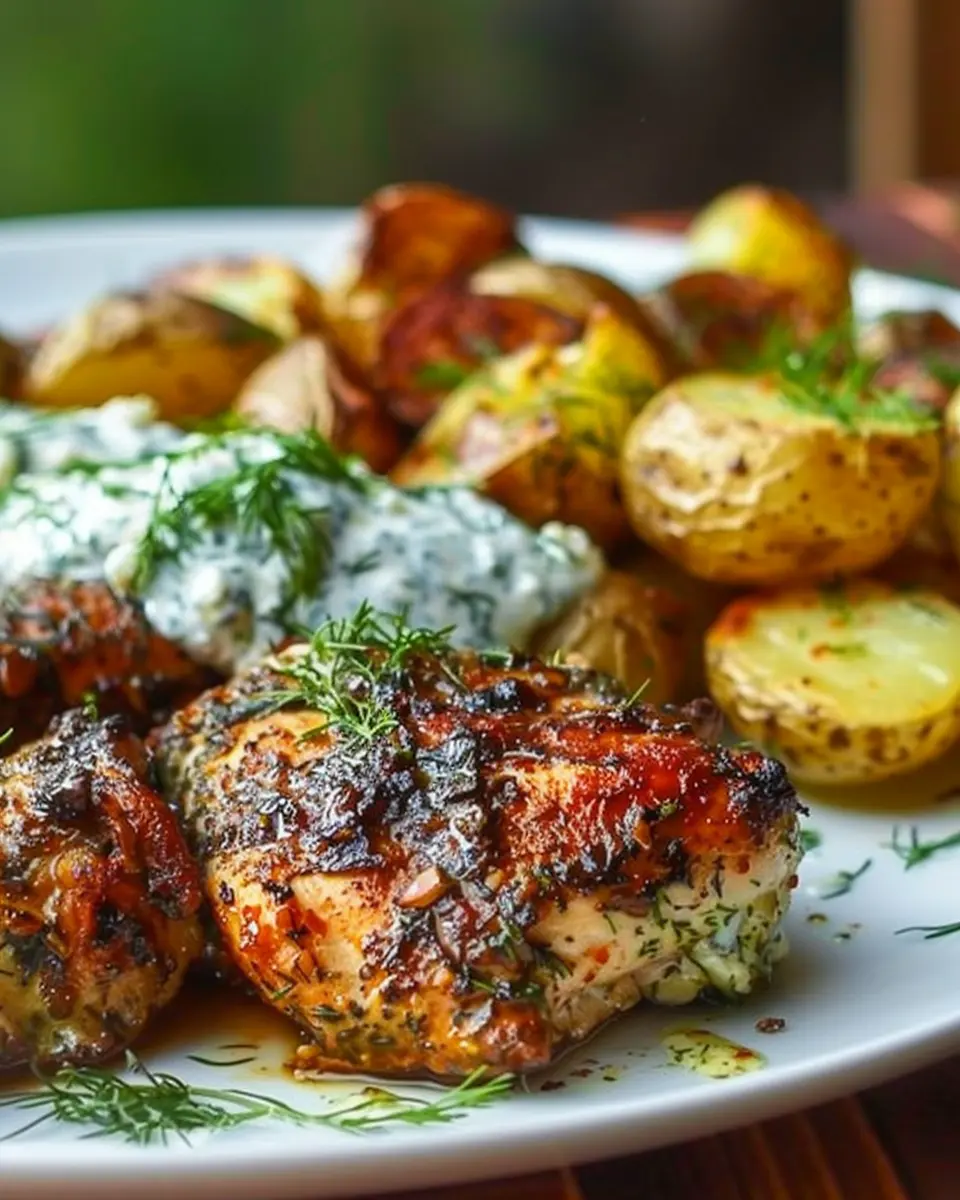 Keywords: Spicy Yogurt Marinated Chicken, Dill Feta Cream, Crispy Baby Potatoes