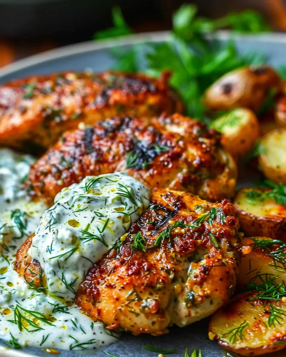 Spicy Yogurt Marinated Chicken with Dill Feta Cream & Crispy Baby Potatoes